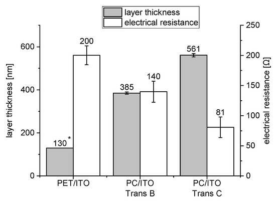 The ITO-coated PET film (127 µm) with an ITO layer thickness t of 130 nm (Sigma Aldrich Chemie GmbH, Taufkirchen, Germany) was used as purchased. The PC film Makrofol 1-1 (Covestro AG, Leverkusen, Germany) with a thickness of 250 µm was sputtered with two different commercially available ITO coatings, ‘Elamet Trans B’ and ‘Elamet Trans C’ from Nanogate GfO Systems GmbH (Schwäbisch Gmünd, Germany), which differ in terms of their layer thickness, sheet resistance, and transmittance. The substrate materials’ properties are summarized in Table 1 and the sheet resistance and transmittance at 550 nm of the ITO-coated substrates are given in Table 2.