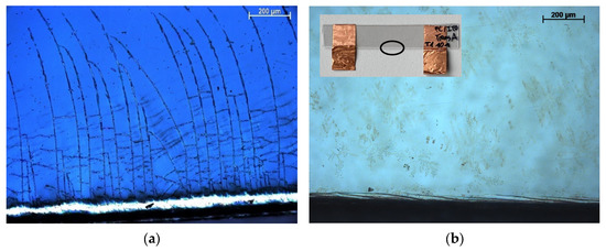 Regardless of the stress type, the edge areas of the various layers exhibit characteristic crack structures due to the cutting process (Figure 5). In the PC/ITO (385 nm) samples, the cracks run from the edge region about one millimeter into the interior of the layer (Figure 5a); meanwhile, in the PET/ITO (130 nm) samples, the cracks run largely parallel to the edge and extend only about 0.1 mm into the interior (Figure 5b). This crack structure can be explained by the elastic and plastic deformation that occurs during the cutting process, which causes the brittle ITO layer to crack. The crack tips in the edge areas are particularly problematic under the thermal and/or mechanical stress investigated here, since stress peaks in the layer occur at these points and cracks might propagate from there over the entire surface [21].