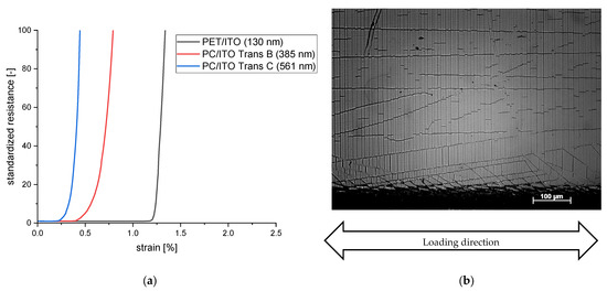The typical course of the normalized resistance of the ITO layer under mechanical strain is almost constant until the critical strain is reached, and then it increases sharply (Figure 6a). There is a certain initial crack strain at which the mechanical stress on the ITO layer exceeds a threshold value, causing the layer to fail mechanically and cracks to form; this result is similar to that reported in the literature [11,12]. These cracks lead to a sharp increase in electrical resistance since the air between the cracks has an insulating effect. Figure 6b shows a pronounced crack structure orthogonal to the loading direction after the tensile test, as well as wrinkles that are presumably due to the Poisson effect in the tensile direction.
