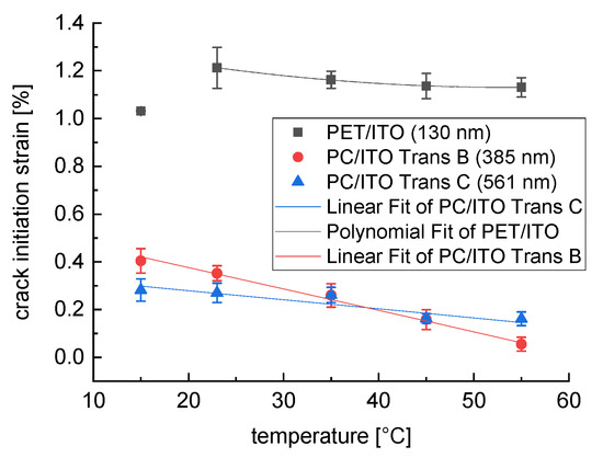While the crack initiation strains of PC/ITO Trans B and PC/ITO Trans C show essentially linear temperature dependence, as expected, this seems to be nonlinear for PET/ITO (the value at 15 °C was excluded in the polynomial fit of the data). This behavior could indicate the presence of relaxation effects, which are amplified by the raised test temperatures. Here, the thermally and mechanically induced stresses in the interface layer might have been reduced due to relaxation, considering the aforementioned low heat deflection temperature of PET, at 65 °C. Nevertheless, the mean deviations are not statistically significant, so further investigations must be carried out.