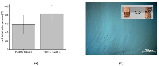 (a) Crack initiation temperatures of PC/ITO Trans B (n = 10) and PC/ITO Trans C (n = 5); error bar equals two standard deviations. (b) Crack development in the PC/ITO layer under thermal stress from the edge area (bottom) through the specimen width (top).