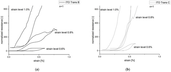 The following section discusses the behavior of the normalized resistance of the PC/ITO samples under cyclic loading, which is shown in Figure 9. For both the PC/ITO Trans B and Trans C coating types, no changes in the normalized electrical resistance occurred at strain level 1 (ε = 0.2%), which is below the crack initiation strains at 23 °C, and even at level 2 (ε = 0.4%), which is slightly higher than the average crack initiation strains at 23 °C. This result was not expected. On the one hand, it is possible that the measured samples had a crack initiation strain above 0.4%, which is quite plausible considering the scatter of the measured values at 23 °C (Figure 7); on the other hand, the preceding level 1 strain could have had an influence. An increase in resistance occurred for both coating types at the third strain level (ε = 0.6%). The level of resistance at the different strain levels differs depending on the coating type. Furthermore, the resistance drops close to the initial resistance after the third strain cycle, while a higher final resistance is present in the subsequent strain cycles. This behavior can be explained by the elastic and plastic deformation of the PC substrate. A predominant elastic deformation causes the cracks to close partially or completely while relieving, causing the resistance to drop to almost the initial value as a result. The higher the plastic deformation part is, the more cracks exist that do not close while relieving, and a higher resistance remains. The thicker ITO Trans C coating differs mainly in terms of the slope of the resistance increase, which rises more rapidly (Figure 9b). This behavior can be explained by the higher brittleness of the Trans C coating due to its greater coating thickness. This results in a higher crack density due to the mechanical strain, which leads to a more rapid increase in resistance.
