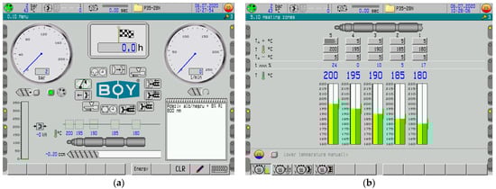 (a) The interface of the injection machine, and (b) the temperature regime on the areas of the cylinder of the injection machine.