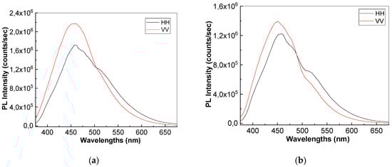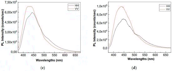 Photoluminescence spectra in polarized light of the following: (a) TPU:TPO 2:1; (b) TPU:TPO 2:1 + 12% BaTiO3, (c) TPU:TPO 2:1 + 25% BaTiO3, and (d) TPU:TPO 2:1 + 35% BaTiO3.