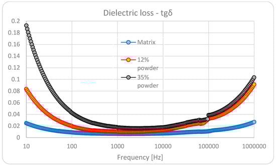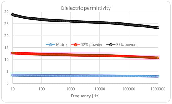 It is obvious that the addition of BaTiO3 dramatically increases the dielectric permittivity, from about 3.5 of the matrix towards about 13 for an addition of 12% BaTiO3 and finally towards about 28 for an addition of 35% BaTiO3 at 10 Hz frequency. With the increase in frequency, all permittivity values are decreasing, with the largest decrease being for the composite with the higher content of BaTiO3.