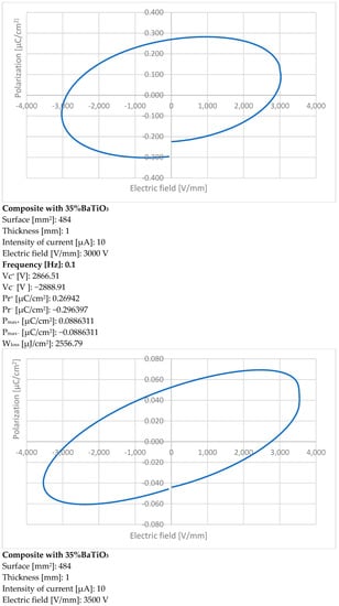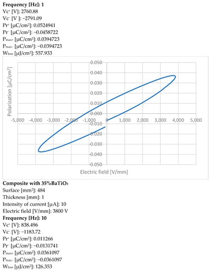 The values expressed as positive Pmax and negative Pmax show the symmetry of the curve at the maximum polarization level. The values expressed as negative Pr and positive Pr show a small difference due to the fact that the hysteresis curves do not fully close, but this aspect is characteristic of BaTiO3. Vc values depend on applied voltage and can be further correlated with the size of the granules, but this is not relevant in our case. Depending on the voltage applied to the samples, different hysteresis curves are obtained, and the maximum polarization is correlated with the applied voltage values. By increasing the frequency value of the applied voltage, a flatter curve is obtained. The angle of inclination of the curve depends on the concentration of the inorganic powder; e.g., an angle of about 45° is observed at 10 Hz for the addition of 35% BaTiO3.