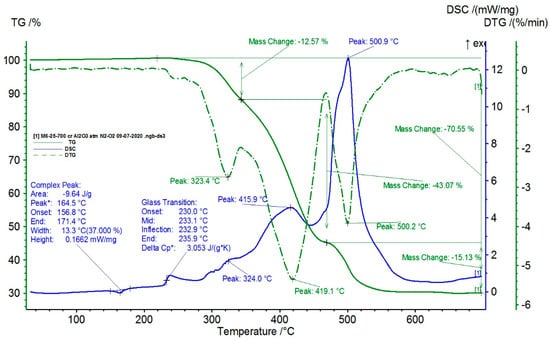 - TG/DSC thermal analysis, performed on a STA 449 F3 Jupiter TG-DSC simultaneous thermal analyzer, Netzsch (Selb, Germany), working in the temperature range up to 1550 °C, in an inert, oxidizing, reducing, static, or dynamic working atmosphere. The device is provided with a vacuum system with a maximum of 10−2 mbar.