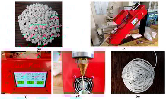 Specific filaments for 3D printing with a diameter of 1.75 mm from the composite pellets with 35% BaTiO3; (a) pellets; (b) laboratory extruder; (c) temperature control; (d) filament generation through the extruder head; (e) filament reel.