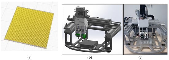 Three-dimensional printed experimental structural model and the dedicated printer; (a) rectangular parallelepiped mesh; (b,c) images of the tailored printer (face and side view).