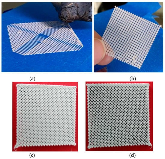 Three-dimensional printed devices for energy harvesting as precision mesh structures; (a,b) tests with progressive deposition of filament with different angles; (c,d) final mesh structures with different densities.
