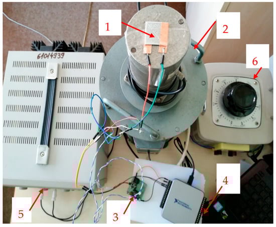 The test stand used for the production and acquisition of the signal includes the following: 1—device/sensor; 2—vibration creation equipment; 3—capacitor charging circuit; 4—NI USB acquisition board—6001; 5—direct current source (constant voltage 24 V); 6—autotransformer (alternating voltage supply)—for vibration increase/decrease regime.
