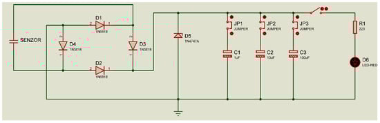In our case, a very common electronic processing module, as presented in Figure 13, was used to collect the energy of the oscillations generated by the sensor and identified in Figure 12 as 3—capacitor charging circuit.