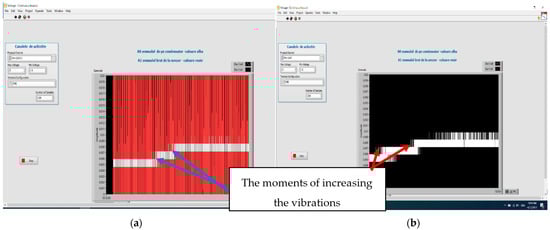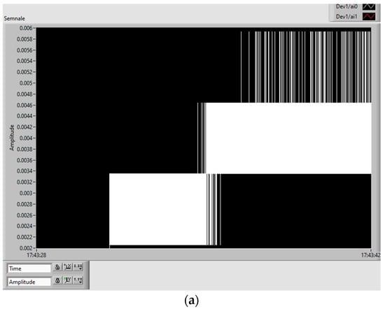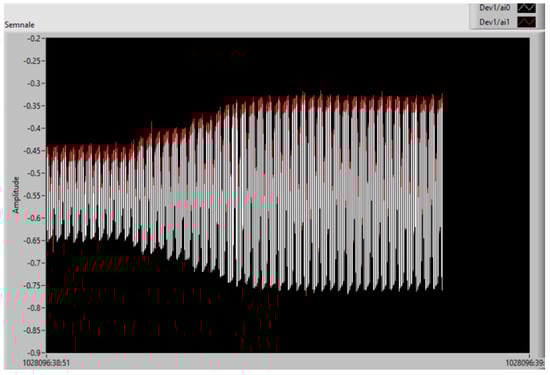 The analog signals when increasing the voltage of the vibration device, i.e., the vibration amplitude level increases, are presented in Figure 14. The signal on the sensor is represented by red oscillations, and the signal on the charging capacitor by white oscillations. The scale is related to signal period, and so the interpretation of the results is difficult without analyzing the real charging phenomenon.
