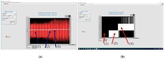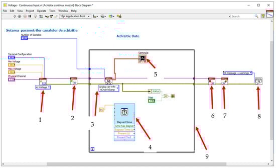That is why intelligent signal processing was embedded by using a virtual instrument (VI) developed under the LabVIEW graphical programming environment [40], briefly presented in Figure 15. After the signal has been acquired with the acquisition board, it is digitized and then transferred to the PC via the USB port. From the USB port, the acquired signal is then processed and displayed using the VI. Block 1 is the data acquisition board setup in subVI. The measured quantity will be set; in our case, it will be “AI Voltage”, i.e., the analog voltage. Block 2 is a block used to open a signal acquisition “task”. If this subVI is not used, it is possible for the application to start an unsynchronized signal acquisition by itself. If the “DAQmx Start Task VI” subVI and the “DAQmx Stop Task VI” subVI are not used when the “DAQmx Read VI” subVI or the “DAQmx Write VI” subVI are used multiple times (how it would be in a loop) and the acquisition starts and stops repeatedly, starting and stopping a purchase repeatedly reduces app performance. For a continuous acquisition of the signal, the acquisition block (3) is inserted into a “WHILE” loop (9) that will run until an event occurs that will interrupt the running of this loop, either an error or pressing the “STOP” button.