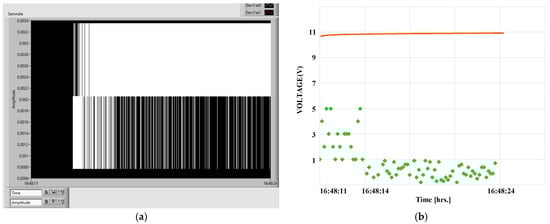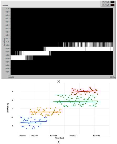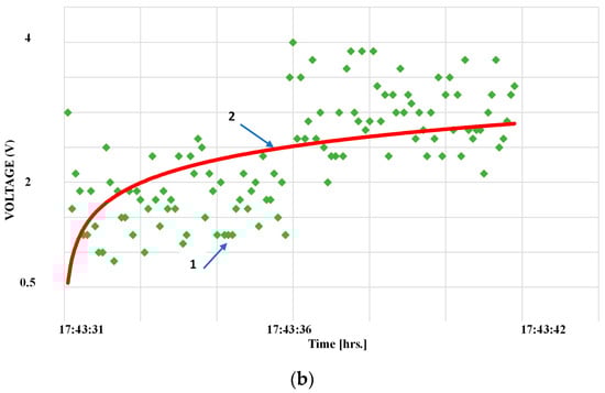 In Figure 17, this process is more explicitly explained, where in Figure 17b, 1–represents the individual charging voltage levels, and 2–represents the average charging characteristic of the capacitor. When associating the digital signal on the capacitor with the charging characteristic. Here, 1 represents the instant charging values from the sensor (green), and 2 represents the cumulative charging of the capacitor (red curve).