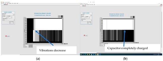 The charging of the capacitor when vibrations decrease: (a) capacitor on charge; (b) capacitor fully charged.