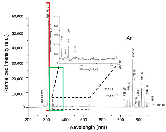 The optical emission spectra of the plasma over the polymer solution. (The red line shows the intensity of the OH group, and the green line shows the intensity of N2).