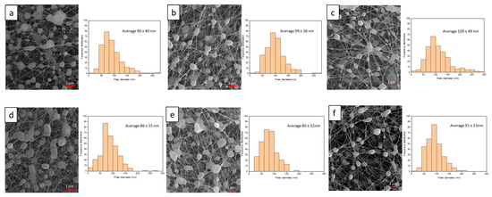 Moreover, the viscosity of the solution is important in estimating the fiber diameter and morphology using electrospinning, which measures a material’s resistance to flow. Usually, the solution viscosity is related to the extent of polymer molecule chain entanglement within the solution. Beads are formed instead of fibers at a very low viscosity, and at a very high viscosity, it is difficult to extrude polymer solution; an optimum viscosity is required to form fibers via the electrospinning technique [57,58]. Table 2 shows that as the PES time increases, the viscosity increases and the beads in the nanofiber membrane decrease. The viscosity of the initial solution was 269 mPa∙s, which subsequently increased to 296 mPa∙s after 30 min of plasma treatment. Furthermore, at 60 min, it further increased to 331 mPa∙s, resulting in a significant increase in fiber diameter, from 90 ± 40 nm to 99 ± 36 nm (30 min plasma treatment) and 109 ± 49 nm (60 min plasma treatment). When 1% ME was added to the polymer solution, the fiber diameter was reduced from 86 ± 35 nm to 80 ± 32 nm (30 min plasma treatment) and 91 ± 33 nm (60 min plasma treatment). This is due to the ethanol being nonsolvent in the polymer solution, and the addition of ethanol decreases the surface tension of the solution, resulting in a reduction in viscosity and fiber diameter [59].