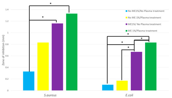 This study investigated changes in the antibacterial performance of the electrospun nanofiber membrane with increasing treatment time, using E. coli and S. aureus as test organisms. Bacteria were grown on nutrient agar at 37 °C for one day. The bacterial cell count was adjusted to 105 CFU using nutrient agar medium. To test for antibacterial activity, 100 µL of the bacterial suspension was dropped onto four types of electrospun nanofiber membranes: untreated, untreated with 1% ME, plasma-treated, and plasma-treated with 1% ME. The bacterial suspension was then evenly spread using a spreader. The inoculated electrospun nanofiber membrane was dried for 1 h on a clean bench. The dry electrospun nanofiber membrane was immersed in a tube filled with 20 mL of nutrient agar and incubated for 6 h at 37 °C. The cultured suspension was vortexed for 1 min and then used to confirm the antibacterial effect. Survival numbers were obtained by 10-fold serial dilution of bacterial cell suspensions in nutrient agar media, and 100 µL of bacterial suspension was spread on solidified agar plates and incubated for 1 day at 37 °C to obtain viable bacterial counts. The tests were performed on four sample electrospun nanofiber membranes. The antibacterial efficiency or inhibition rate (ƞ) was calculated based on the following equation [30]: