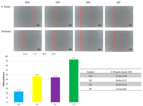 The fabricated nanofibers were covered with fresh sterile medium and were extracted at 37 °C for 24 h. The HDFa cells were seeded in 6-well plates and starved overnight to 24 h before the experiment. The cells were scratched by a scratch tool. The culture medium was then immediately removed and rinsed with PBS (Phosphate Buffered Saline) to clean off any cellular debris. The removed medium was replaced with fresh media (control group) and extract medium (sample). After a 12 h, 24 h, and 48 h incubation period, the cell condition was observed and documented. The distance between the control and treatment cells was then calculated using ImageJ software. We calculated the percentage of wound closure according to [24]: