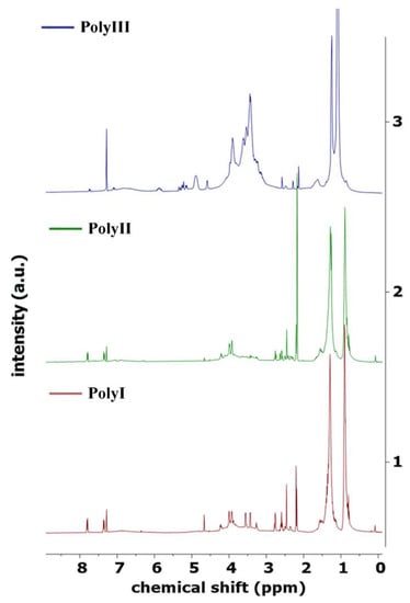 NMR spectroscopy is a powerful technique that can be used to obtain approximate ratios of chemical environments of protons and carbon atoms in bio-oils. An in-depth analysis of bio-oils using NMR may allow for clearer characterization, including relative substructure compositions such as the presence of functional groups, degrees of saturation, branching, or aromatic content [,,,,,]. The 1H of the three different biopolyols—PolyI, PolyII, and PolyIII—is shown in Figure 3. The integral values of the selected regions of the spectra are shown on a percentage basis in Table 5.