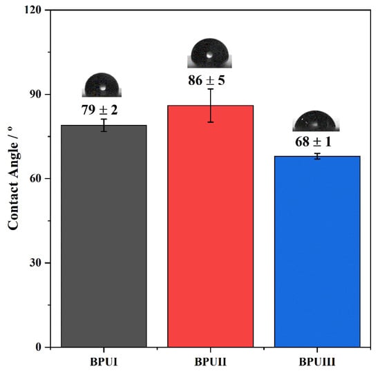 The hydrophobicity of the coatings was evaluated by measuring the optical contact angle (OCA) of water on dry BioPU samples through the sessile drop method. Static OCA measurements on the BioPU films were performed using a JAI CV-A50 (JAI Ltd., Copenhagen, Denmark) video camera attached to a Wild M3Z (Leica Microsystems, Wetzlar, Germany) microscope connected to a Data Translation DT3155 frame grabber and a micrometric syringe to dispense Millipore water droplets (2 to 3 μL) at room temperature. The acquisition and analysis of the images were performed using ADSA-P software (Axisymmetric Drop Shape Analysis Profile). A minimum of 10 measurements were taken in different regions of the coating surface.