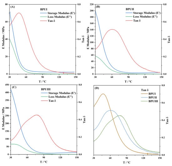 Dynamic mechanical analyses (DMA) were carried out on a DMA Q800 device (TA Instruments, New Castle, DE, USA). Multi-frequency strain of samples (20 × 14 × 3 mm) was performed with a heating rate of 2 °C·min−1 from 30 to 150 °C, operating at a frequency of 1 Hz and an amplitude of 15 µm. The cross-linking density (νx) of all the BioPUs was estimated according to the kinetic theory of rubber elasticity (Equation (6)) []. The molecular weight of the chain between cross-linking points (Mx), inversely proportional to , was calculated according to Equation (7):