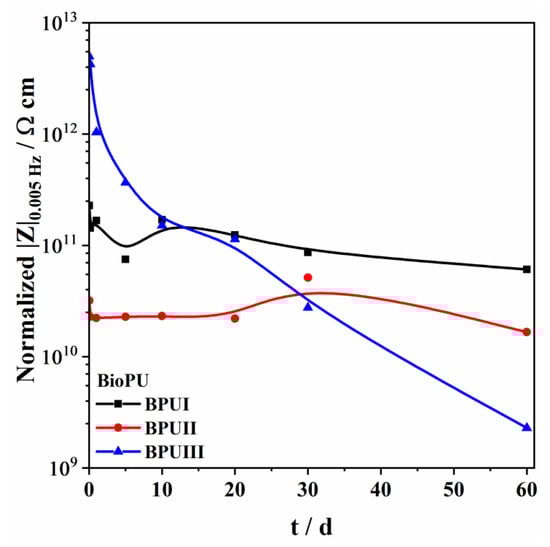 Electrochemical impedance spectroscopy (EIS) was used to study the barrier properties of the coating applied on steel immersed in NaCl 0.05 M. A Gamry potentiostat Reference REF 600 (Gamry Instruments, Pennsylvania, USA) apparatus was used for the measurements, carried out on a conventional three-electrode cell configuration inside a Faraday cage. A saturated calomel electrode (SCE; model HI5412, Hanna Instruments, Woonsocket, RI, USA) was used as the reference electrode, a platinum coil as the counter electrode, and the coated DC01 carbon steel, with a total exposed area of around 3.46 cm2, was used as the working electrode. The EIS measurements were carried out at open circuit potential under a 10 mV (r.m.s.) sinusoidal perturbation and in the frequency range from 50 kHz to 5 mHz. ZView® software (ScribnerAssociates, Southern Pines, NC, USA) was used to treat the obtained EIS data.