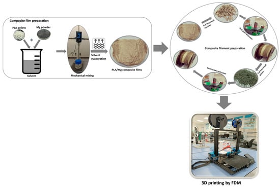However, recent papers on the PLA/Mg composite 3D printing have employed different preparation techniques [14,15]. In this paper, we aim to successfully develop filaments for FDM using a simple solvent evaporation technique. Four PLA + Mg compositions were developed and characterized to assess the effectiveness of the technique and were then used for printing test samples on a low-cost FDM 3D printer.