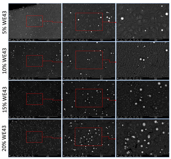 To understand the morphology of the developed films, an SEM examination was carried out. The surface morphology of the film will help us understand how the final 3D-printed surface would look and behave, which will in turn influence the cell attachment and proliferation. The images were also studied to understand the distribution of magnesium particles in the matrix. Since all the films were continuous and defect-free, it was clear that the preparation technique was effective. The SEM images of various WE43 percentages in the PLA matrix are depicted in Figure 3. All the images show the presence of WE43 magnesium particles distributed uniformly throughout the area under study. This indicates that the preparation technique has led to the homogenous mixing of the magnesium particles in the PLA matrix in the various blend ratios. As can be seen in these images, the Mg particles are largely uniform and evenly dispersed throughout the PLA matrix, suggesting the mixing method’s potential effectiveness in producing high-quality polymer/metal composite filaments. In turn, this would facilitate the extrusion of filaments with uniform distribution for flawless 3D printing. The examined films have a rough surface, which is made even rougher by the integration of a higher magnesium content as a result of the presence of magnesium on the surface. The evaporation of chloroform has led to the formation of grain-shaped features on the surface of the films. This can be attributed to the availability of more nucleation sites in the presence of a higher number of magnesium particles by the particle simulated nucleation (PSN) phenomenon. In particulate-reinforced materials, recrystallization by particle-stimulated nucleation generally dominates during thermomechanical processing. This can be seen in the literature, where different reinforcements in the polymer matrix have led to the observance of this phenomenon [16,17,18]. The increase in the presence of nucleation sites limits the growth of the grains in the composite leading to cracks/voids on the surface as is evident in the images of higher Mg compositions.