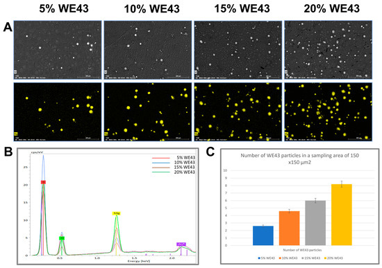 Figure 4 shows the EDS mapping images of the various compositions of PLA/WE43. As the concentrations of WE43 increases, the number of magnesium particles visible across the surface also increases. The magnesium particles are uniformly distributed in all cases, and the number of particles increases with increasing concentration of WE43. The increase in the content of WE43 in the blends can be seen to be validated by the similar linear relationship in the average particles in a random sampling area of the EDS images.