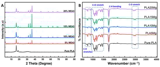 The XRD spectra of PLA and Mg-incorporating samples are shown in Figure 5A. As the concentration of Mg increased in the PLA samples, the peaks in the Mg alloy at 2θ = 32°, 34°, and 36° became more pronounced. The pure PLA had a semi-crystalline structure, as indicated by peaks at 2θ = 16° and 19.5°, which correspond to the “α” crystallization phase. With increasing Mg concentration, the XRD pattern showed less intense peaks, indicating a lower degree of crystallinity for the Mg-loaded samples. It is important to note that the XRD peaks only provide information about the crystallinity of a thin surface layer and the bulk crystallinity may be different. These results are in agreement with similar studies reported in the literature [19].
