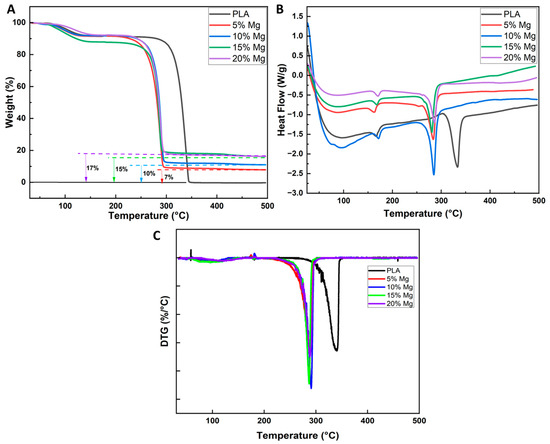 TGA is commonly used to determine the thermal stability of a material, as well as its decomposition temperature and the weight loss resulting from thermal decomposition. In the case of polylactic acid (PLA), TGA can be used to determine the temperature at which the material starts to degrade and the extent of degradation that occurs at different temperatures. According to Figure 6A,C, an initial mass loss was observed for all samples after 70 °C, most likely because of the solvent evaporation. PLA degrades thermally between 300 °C and 370 °C, whereas PLA/Mg composites start to degrade sooner and do so between 250 °C and 300 °C. Mg addition speeds up heat breakdown in the PLA. In contrast to pure PLA, which was entirely decomposed, the composite mixes also showed a residue quantity. This is to be expected, as the remaining residue can be associated with the magnesium content. The residual amount values associated with magnesium are close to the original magnesium wt% in the composite samples as shown in Figure 6A. The optical microscopy study of cross-sections revealed that Mg particles are evenly distributed within the PLA/Mg composites (Figure 3 and Figure 4). It is clear from these results that Mg incorporation speeds up the degradation of PLA when subjected to elevated temperature. When the polymer is exposed to high temperatures, Mg acts as a catalyst for the PLA depolymerization reaction. Similar thermal analysis results have been reported in the literature [21,22].