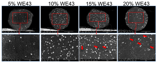 It was feasible to create PLA filaments with progressively increasing Mg contents of 5, 10, 15, and 20% (wt). For each PLA-WE43 composition, melts were extruded from the extruder and monitored in real time over a period to determine when the desired filament diameter of d = 1.75 ± 0.25 mm was reached. Only filaments in this diameter range can be used in the SOVOL SV02 printer. We evaluated the process stability over time by tracking the divergence in filament diameter from the filament extruder by continuous monitoring. The non-uniform extruded filaments were again chopped into little pieces and extruded a second time to enhance the quality. This made it easier to prepare filaments for feeding into the printer with regular lengths and uniform diameters. Micrographs using scanning electron microscopy showed that the Mg particles within PLA-Mg filaments were distributed uniformly (Figure 7). The examined filaments have a rough surface, which is made rougher by incorporating magnesium. The Mg particles are comparatively uniform and were evenly dispersed throughout the PLA matrix, as seen in this picture, indicating the mixing method’s potential effectiveness for producing high-quality polymer/metal composite filaments. However, in composite filaments with an Mg concentration of more than 10 wt%, pores can be detected close to the filler particles. This might result from the magnesium particles’ reduced flowability and the accumulation of numerous clustered magnesium particles on the composite’s outer surface. The best distribution is shown by the 15% WE43 samples, although the printability may suffer due to printing disruptions because of the pores seen in the cross-section. Due to the uneven distribution of magnesium particles and the increased prevalence of pores, 20% WE43 samples display undesirable characteristics. This result might be explained by the higher volume fraction of Mg particles in the molten polymer, which is related to increased viscosity. Higher solid contents result in a typical increase in viscosity that makes it challenging to extrude filaments as mentioned in the literature [28]. During the extrusion process, the Mg particles could prevent the PLA matrix from flowing freely, creating micro voids close to the Mg fillers (marked with red arrows). According to the reported data, increasing the Mg content in the PLA-Mg composite filaments causes Mg particles to cluster and develop pores around them, which can all have an impact on the qualities of printed items. These results support those reporting in the previous literature, where similar findings were observed using a similar experimental design [15].