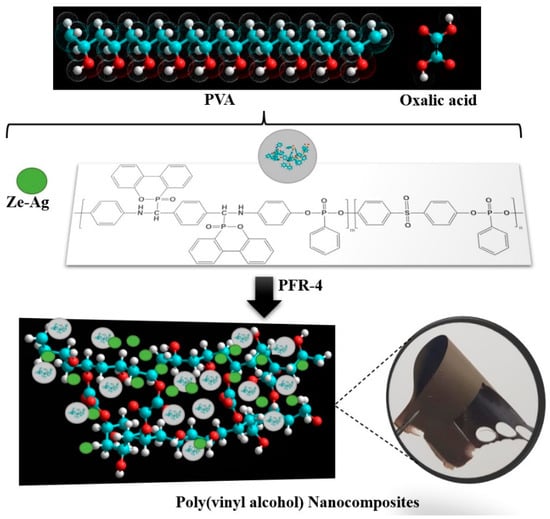 Due to its outstanding performances, such as the ability to be processed in various forms with 2D or 3D spatiality (films [], multilayer coatings [], membranes [], nanofibers [,], hydrogels [], xerogels [], etc.), biodegradability, biocompatibility, eco-friendly characteristics [], oxygen barrier properties, good chemical resistance, transparency in the visible range and acceptable thermomechanical properties, poly(vinyl alcohol), PVA, is quoted exponentially as one of the most widely used water-soluble polymers appealing for packaging industry [,,,,,]. Although PVA has some limitations such as poor ultraviolet (UV) and moisture barrier properties, high flammability, and weak thermal stability, yet, it presents remarkable blending ability, good interfacial adhesion, and attractive compostable capacity [,]. As sustainable material for rigid or flexible packaging sectors, the main drawbacks of PVA are related to its high-water absorption capacity and lack of antioxidant and antimicrobial properties. The literature survey reveals that many groups have addressed the aforementioned disadvantages in great detail, with each drawback being partially remedied by judicious reinforcement of the PVA matrix in conjunction with suitable biopolymers and/or with well-known additives bearing specific improvements. Yet, there is still room for sustainable development via simultaneous combination of biodegradable semi-synthetic polymers with exceptional additives, or doping nanoparticles which may improve certain synergistic functionalities in the targeted material. Modulating the properties of PVA with organophosphorus compounds and with silver-containing additives, while semi-interpenetration networking with low-molecular dicarboxilic acids, is the key to simultaneously improvement of the thermal stability, resistance against fire and moisture and imparting intrinsic antimicrobial properties. Thus, the present paper focuses on the synthesis and characterization of a series of PVA composites reinforced with oxalic acid, which was chosen to controthe l water solubility of the hydrophilic PVA chains by physical and chemical crosslinking. A novel organophosphorus flame retardant (PFR-4) derived from co-polycondensation in solution reaction of echimolar amounts of co-monomers, namely, bis((6-oxido-6H-dibenz[c,e][1,2]oxaphosphorinyl)-(4-hydroxyaniline)-methylene)-1,4-phenylene, bisphenol S, and phenylphosphonic dichloride, in a molar ratio of 1:1:2, was utilized to impart thermal stablility and resistance against flame and fire, while doping with silver-loaded zeolite L nanoparticles (ze-Ag) was expected to activate antimicrobial properties against different microbial cultures.