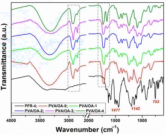 The FTIR spectra of PFR-4, PVA/OA-0, and PVA/OA (1–4) were presented in Figure 2.