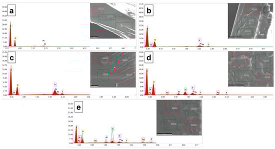 The composition of the PVA/OA matrices was evaluated supplementarily by EDX analysis (Figure 5). The elemental analysis revealed a high content of carbon in all the prepared samples. The presence of the P atom on the surface of the PVA/OA (1–4) samples can be observed in Figure 5 (color boxes). The results showed that the P/C ratio increased from 0.00553 ± 3.26 * 10−5 (PVA/OA-1) to 0.01487 ± 0.0010 (PVA/OA-2) when the amount of PFR-4 was increased from 0.2 g to 0.4 g into the PVA/OA matrix. For the samples PVA/OA-3 and PVA/OA-4, respectively, it was calculated the metal ratio taking Si as the internal standard. The results showed that the metal ratio is relatively low when expressed in term of the Ag/Si ratio and also can be observed an increase of the Ag/Si ratio when the amount of ze-Ag increased from 0.13 g (0.1187 ± 0.010) to 0.26 g (0.1555 ± 0.043). Strong signal characteristics to the silver atoms in the samples PVA/OA-3 and POVA/OA-4 can be observed at the 3 KeV confirming the presence of the AgNP in the PVA/OA matrices [].