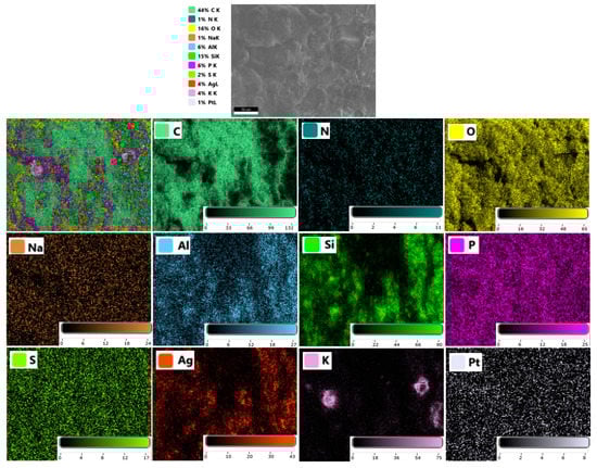 Also, SEM confirmed the characteristic morphology of the ze-Ag (Figure 4a, marked circle) loaded into PVA/OA films. In the Figure 4b,c, the observed small dots confirmed the presence of silver around the zeolite particles. Additionally, the distribution of the ze-Ag can be found as uniform without any notable agglomeration under the observation conditions.