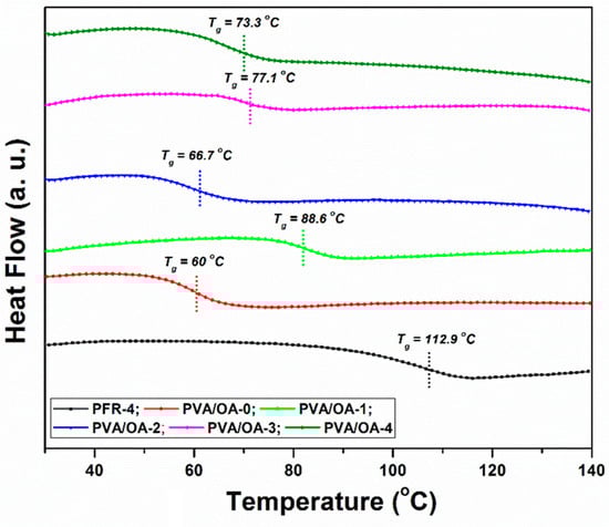 DSC curves for the PFR-4 and PVA/OA (0–4) films.