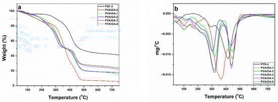TG (a) and DTG (b) curves of the PFR-4, PVA/OA-0, and PVA/OA (1–4).