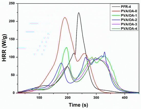 Microscale combustion calorimetry (MCC) tests were performed under controlled conditions. The most relevant data obtained from the MCC tests are presented in Table 5. In Figure 9 and Figure 10, the HRR curves were plotted, depending on temperature and time, respectively. In the case of the analyzed samples (PFR-4, PVA/OA (0–4)), a correlation is observed between HRC and Char Yield for the samples of compounds based on polyvinyl alcohol. Sample PVA/OA-0 has the highest HRC, 305.41 J/(g*K), and lowest Char Yield, 2.4%, and sample PVA/OA-4, with the lowest HRC of 164.57 J/(g*K) also has the highest Char Yield at 22.21%. There is thus an almost halving of 46.12% in HRC and an approximately 20% increase in Char Yield between sample PVA/OA-0 and sample PVA/OA-4. Polyvinyl alcohol samples with PFR-4 in the composition show a decrease in HRC of 21.5% for the PVA/OA-1 sample and 25.2% for the PVA/OA-2 sample, not even a 4% difference between the PVA/OA-1 sample and the PVA/OA-2 sample, which has double content of fire retardant. The addition of zeolite to the flame-retardant samples leads to a major decrease in the HRC, by about 20% compared to the fire retardant-only samples and by about 40% compared to the fire retardant-free sample, but without having large influences on the Char Yield and THR. However, excessive expansion of the silver-free zeolite sample is observed. The fire retardant of the ze-Ag samples (PVA/OA-3 and PVA/OA-4) shows the best fire behavior, from the point of view of the most important parameters discussed in the MCC analysis, both in relation to the PVA/OA-0 and in relation to the other fire retardant samples. It is possible that the addition of ze-Ag helps with the problem of expansion, but the phenomenon of bending of the samples occurs during the temperature rise. These samples, PVA/OA-3 and PVA/OA-4, thus record the lowest HRCs of about 165 J/(g*K), i.e., a decrease of 46% compared to the non-fire-retardant sample and a decrease of about 20% compared to the samples without ze-Ag. For these samples, the highest increase in Char Yield is also observed, but also the lowest decrease in THR, in relation to the non-fireproofed sample. Thus, the Char Yield increases by about 15% for sample PVA/OA-3 and about 20% for sample PVA/OA-4, and the THR decreases by about 23% and 30% for sample PVA/OA-3 and sample PVA/OA-4, respectively. These parameters, for the two samples with fire retardant and zeolite with silver, also show significant increases (Char Yield) and decreases (THR) compared to the fire retardant samples but without zeolite in the composition.