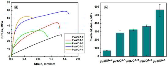 Film-like materials are subjected to various external forces during practical uses. If the major mechanical properties fail to meet the basic requirements, their application fields will be largely restricted. Tensile strength and Young’s modulus are two key performance indexes for evaluating the mechanical properties of films. The mechanical behavior of the PVA/OA films reinforced with PFR-4 and ze-Ag is represented in Figure 11. The stress vs. strain curves of the PVA/OA films explicates the mechanical properties such as ultimate tensile strength (UTS), elastic modulus (Young’s modulus), and elongation at break (EB).