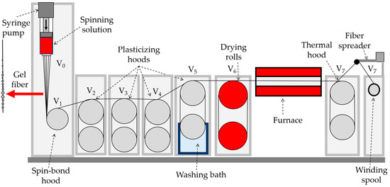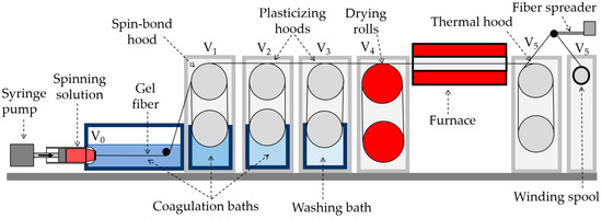 The spinneret with a diameter of 600 µm is immersed in a coagulation bath during the wet spinning process (DMSO:water baths compositions: 85:15; 80:20; 50:50, correspondingly) and the spinning solution supply unit is located horizontally (Figure 1). In the water washing bath, the fiber is washed from the solvent residues and goes to the drying rolls, the temperature of which is 80 °C, after that, it is thermally stretched at 100 °C in an oven and goes to the thread spreader. Usually, the speed at each stage is higher than at the previous one. The feed rate of the solution was 0.012 m/min, the temperatures of the drying drums and thermal stretching, as well as the speed of rotation of the winding at each stage, were adjusted depending on the properties of the spinning system and fiber and taking into account the requirements for the degree of drawing.