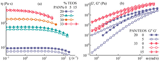 (a) Flow curves and (b) frequency dependences of dynamic moduli for the spinning PAN-DMSO solutions with TEOS at 70 °C. PAN and TEOS concentrations are shown in the figures.