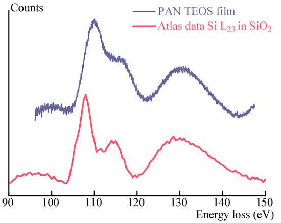 Figure 5 shows the EELS spectrum of a PAN film annealed at 150 °C for 10 h for TEOS hydrolysis compared with data for Si L23 in SiO2 transitions obtained by Gatan company [39].