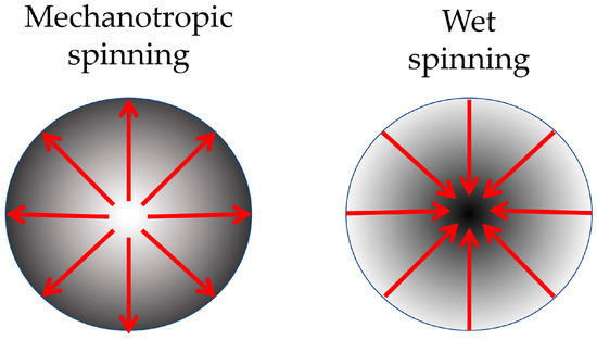 In the case of the wet spinning method, the mechanism of the solution coagulation is determined by the kinetics of interdiffusion of the coagulant into the fiber and the solvent outward, which differs significantly from the mechanotropic method, where a predominantly unidirectional process of solvent release to the outside takes place.