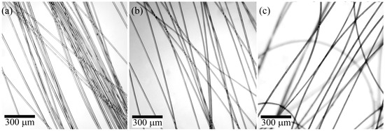 Images of fibers, contained: (a) 0%; (b) 10%; (c) 30% of added TEOS per PAN. Images were obtained by transmitted optical microscopy.