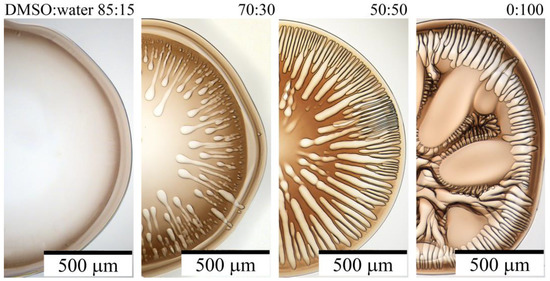 The model drop method makes it possible to study the effect of changing the composition of the coagulant on the resulting morphology of the fiber cross-section model. Figure 9 shows the result of the interaction of 20% of PAN-DMSO solution with some coagulants prepared with a mixture of water with DMSO in different ratios.