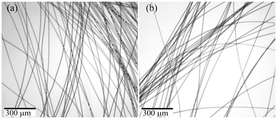 The bundle of spun fibers was analyzed by optical microscopy under transmitted light, and the corresponding images are presented in Figure 7.
