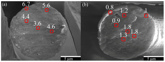 Images of fiber cleavages (a) PAN + 30% TEOS mechanotropic spinning; (b) PAN + 13.5% TEOS wet spinning. Areas in which the silicon content was determined are marked in red, the numbers indicate the Si wt.%. Images were obtained by scanning electron microscopy.